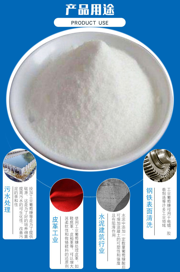 3、工業(yè)葡萄糖用做鋼鐵表面清洗劑:鋼鐵表面如需要鍍缽、鍍鉻、鍍錫、鍍鎳以適應特殊用途時,如制造馬口鐵,鍍鋅板,表面鍍鉻(電度)等,其鋼坯表面均需經過嚴格清洗,使鍍層物與鋼鐵表面牢固結合,這時候其清洗藥劑中添加葡萄糖酸鈉將會達到十分理想的效果。工業(yè)葡萄糖可用于電鍍,膠卷制造等許多工業(yè)領域。